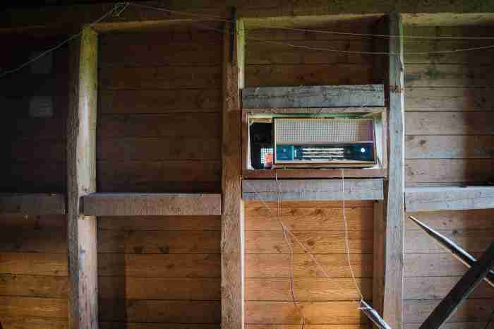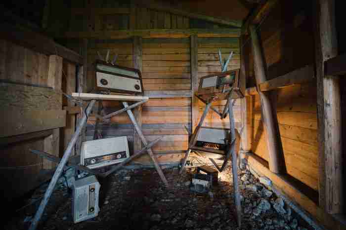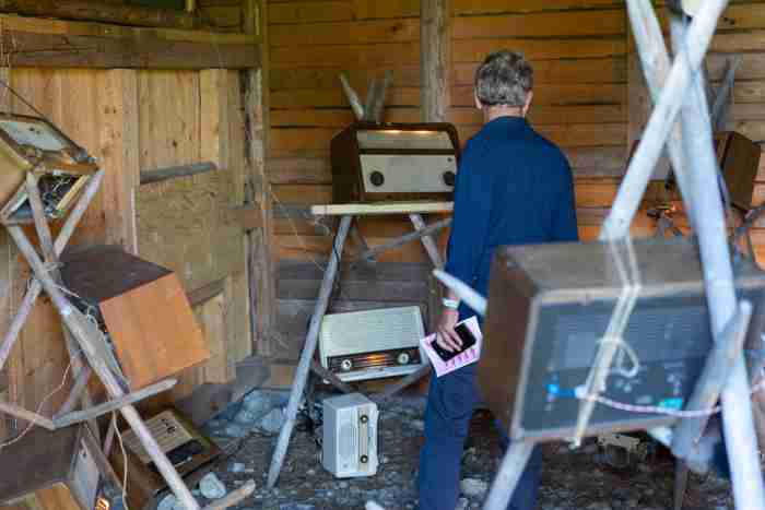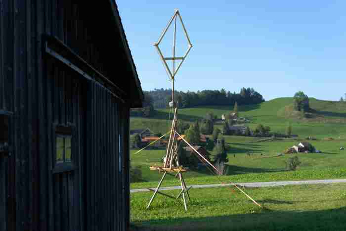 The Solothurn sound artist Flo Kaufmann (*1973) describes himself as a "bricoleur universel". As a trained electrical engineer, he has in-depth knowledge and understanding of the world of sounds, be they acoustic or electronically generated. He works with obsolete sound recording technologies and disused electrical appliances to create fantastic sound machines and bizarre instruments. In his work "The Shack", he explores the electromagnetic fields around Gais by installing a conglomeration of wave catchers, receivers, antennas and devices, thus making hidden signals and fields of action audible and tangible.