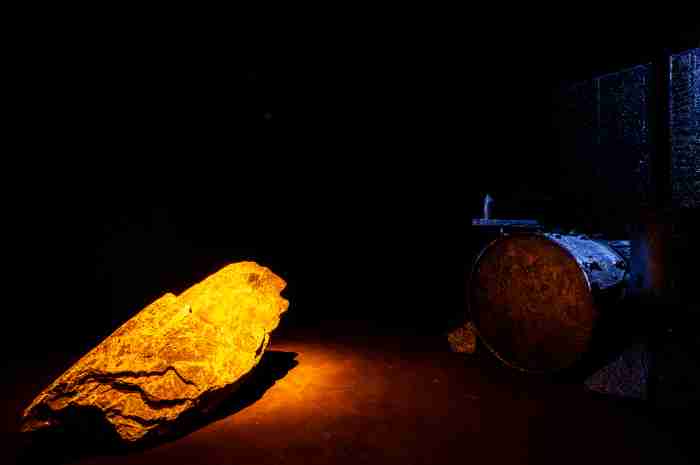 «Asphalte» is a performance by Babel on a sculpture by Bach, shown for the first time in 2020. At the center is a drum kit covered in bitumen. For KLANG MOOR SCHOPFE 2025, they have further developed the work in a site-specific way.