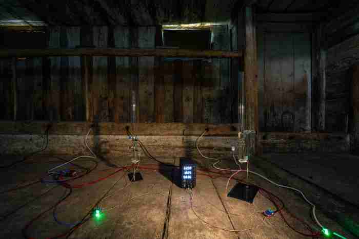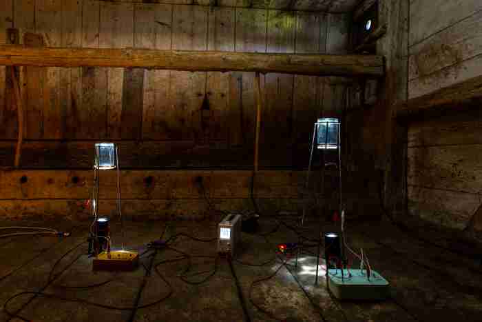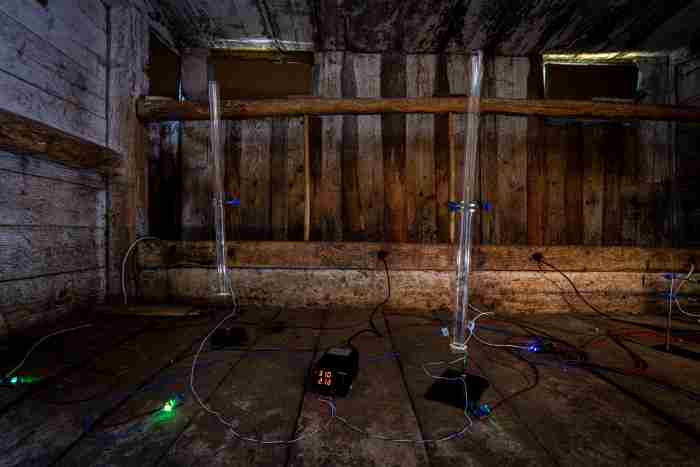 The artist Tim Shaw (*1987) works with sound, light and communication media to create performances, installations and site-specific interventions. His work demonstrates an extremely diverse practice. He has invented artistic methods to listen into the sound world of insects, created augmented sound walks and performances for high-voltage devices, transmitted radio broadcasts through trees and extracted sound material from rocks. Interdisciplinary collaboration is central to his work: he regularly collaborates with experts from a wide range of fields, from musicology to medicine, geology and astrophysics. In 2023, Shaw took part in the Fellowship Program of the Collegium Helveticum, which promotes the exchange of science and art.